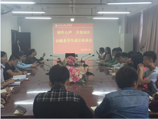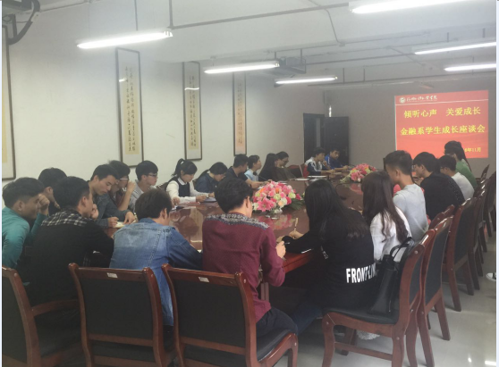 2016年11月1日,金融系在B606会议室召开“倾听心声,关爱成长”主题学生座谈会。来自金融系27个班级的学生代表参加座谈会,系主任陈钦老师等骨干教师出席座谈会并与学生现场交流,系工作室负责人林顺义老师主持座谈会。
