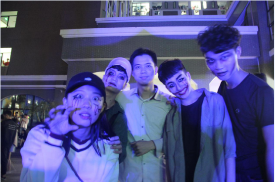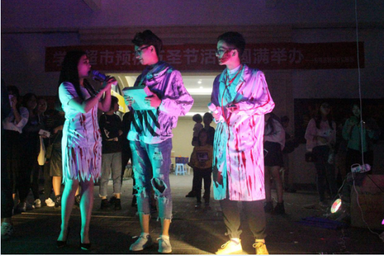 黑夜降临,广场上聚集不少的同学们正准备着万圣节晚会的狂欢。一群“鬼妆看客”分散在人群中。伴随着快闪小鬼的出现晚会拉开序幕,抓小鬼、抢糖果、换兑奖券、抽大奖让晚会变得刺激与众不同。本次活动不仅让同学们丰富课余文化生活还能感受到中西方的文化交流、异国风情的节日气氛。